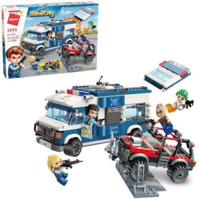 Конструктор QMAN из серии «MineCity» позволит ребенку собрать и разыграть сценку, в которой полицейские на автозаке, отражают нападение преступников на джипе.