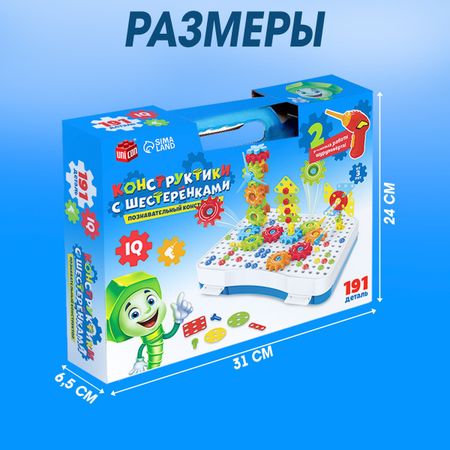 Конструктор с шуруповертом «Конструктики с шестеренками», 191 деталь. Увлекательный конструктор-мозаика — то, что надо маленьким любителям всего необычного! Задача малыша: вкручивать болтики и собирать картинки с помощью игровых полей и красочных фигурок. Конструктор станет прекрасной основой для получения необходимых бытовых знаний. Малыш научится закручивать шурупы и придумывать новые конструкции. Ребенок с удовольствием будет играть получившейся игрушкой, а когда надоест, сможет придумать что-то совершенно новое. <b> Преимущества конструктора</b> <ul> <li> Развивает мелкую моторику рук.</li> <li> Прививает усидчивость.</li> <li> Стимулирует познавательную активность.</li> <li> Развивает внимание и воображение.</li> </ul> Дрель функционирует в двух режимах, она может закручивать и раскручивать болты. Работает инструмент от 2-х батареек типа АА. Батарейки в комплект не входят.