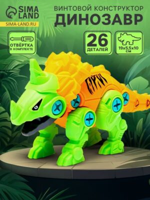 Конструктор винтовой «Динозавр. Стиракозавр», с отверткой, 26 деталей. <b> Конструируем и играем</b> Винтовой конструктор — это увлекательная, яркая игрушка, которая обязательно порадует ребенка! Ведь малыш самостоятельно соберет ее с помощью инструментов, имеющихся в наборе. Занятия с конструктором помогут развить воображение, эмоциональное, визуальное восприятие, мелкую моторику, координацию движений и потренируют навыки конструирования. <b> Особенности</b> Конструктор тренирует важные навыки. Задача малыша: вкручивать болтики и собирать картинки с помощью игровых полей и красочных фигурок. <b> Неоспоримая польза</b> Ребенок получит необходимые бытовые знания, научится закручивать шурупы, болты, шестеренки, пуговки, а также придумывать новые конструкции. Ребенок с удовольствием будет играть с получившейся игрушкой.