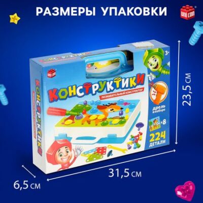 Конструктор винтовой «Конструктики» с шуруповертом, 224 детали + 8 карточек. Увлекательный конструктор-мозаика — то, что надо маленьким любителям всего необычного! Задача малыша: вкручивать болтики и собирать картинки с помощью игровых полей и красочных фигурок. Конструктор станет прекрасной основой для получения необходимых бытовых знаний. Малыш научится закручивать шурупы и придумывать новые конструкции. Ребенок с удовольствием будет играть получившейся игрушкой, а когда надоест, сможет придумать что-то совершенно новое. <b> Преимущества конструктора </b> <ul> <li> Развивает мелкую моторику рук.</li> <li> Прививает усидчивость.</li> <li> Стимулирует познавательную активность. </li> <li> Развивает внимание и воображение.</li> </ul>
