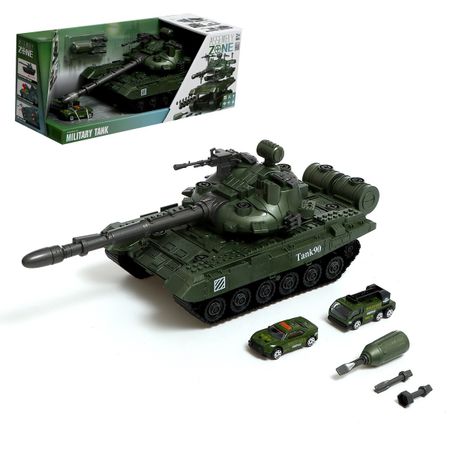 Конструктор винтовой «Боевой танк», свет, звук, инерция, 57 деталей. «Боевой танк» станет надежным спутником для маленького героя. Такая техника может без опасений идти на врага, ведь у нее есть верные помощники — 2 военных машинки. Игрушка вызовет яркие эмоции у ребенка и поможет его почувствовать себя настоящим военным. Винтовой конструктор — это увлекательная яркая игрушка, которая обязательно порадует ребенка! Ведь малыш самостоятельно сможет разобрать и собрать ее с помощью инструментов, имеющихся в наборе. <b> Особенности</b> <ul> <li> Количество элементов — 57 шт.</li> <li> Размер танка: 42,5 × 15,5 × 17,5 см.</li> <li> Размер 1 машинки: 7 × 3,5 × 2,2 см.</li> <li> Размер 2 машинки: 7 × 2,8 × 3 см.</li> <li> Работает от 3 батареек типоразмера LR44 (входят в комплект).</li> <li> Световые эффекты: горят лампочки на корпусе танка.</li> <li> Звуковые эффекты: воспроизводит звук поворота башни, звуки сигнала, работающего мотора, звук сирены и стрельбы.</li> <li> Встроен инерционный механизм. Привести транспорт в движение не составит труда: необходимо лишь отвести машинку назад и отпустить. Игрушка быстро наберет скорость и мгновенно достигнет намеченной цели.</li> </ul> <b> Играем с пользой</b> Занятия с конструктором помогут развить воображение, эмоциональное, визуальное восприятие, мелкую моторику, координацию движений и потренируют навыки конструирования. Ребенок получит необходимые бытовые знания, научится закручивать шурупы, болты, шестеренки, а также придумывать новые конструкции.