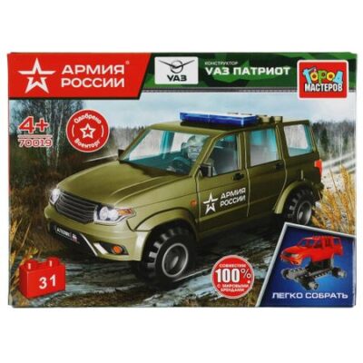 Конструктор ВОЕННЫЙ Город мастеров SB-70019. Конструктор «УАЗ Patriot» из серии «Армия России» ТМ «Город мастеров» понравится маленьким героям.<br> <br> Особенности и комплектация:<br> — 31 деталь<br> — легко собрать<br> — одобрено Военторг<br> — совместим с моделями конструкторов мировых брендов<br> — все детали легко и плотно соединяются между собой<br> <br> С помощью этого занимательного конструктора ваш ребенок может собрать реалистичную модель военной машины. Набор вдохновит малыша на новые увлекательные сюжеты для игр и станет гордостью его игрушечной коллекции.<br> <br> Собирая конструктор ТМ «Город мастеров», ребенок развивает:<br> — мелкую моторику<br> — мышление<br> — внимание<br> — усидчивость<br> — логику<br> <br> Размер упаковки: 19 x 14 x 5 см. Материал: пластмасса.<br> Рекомендовано детям от 4-х лет.