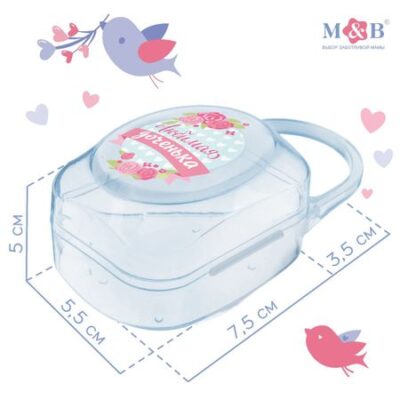 Контейнер для хранения и стерилизации сосок и пустышек «Любимая дочка». В контейнере удобно хранить пустышку, когда вы ее не используете. Контейнер подходит для всех видов пустышек. В нем пустышка не потеряется и не испачкается. Его легко крепить к детской кроватке, коляске, сиденью машины или к вашей сумке.