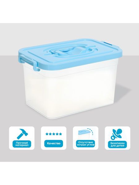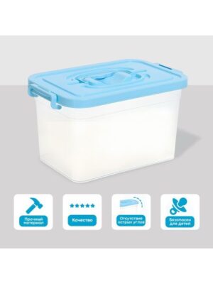 Контейнер для хранения с крышкой, 6,5 л, цвет голубой. Универсальный ящик с вкладышем — практичный и компактный вариант хранения вещей. <b> Особенности контейнера</b> <ul> <li> Товар разработан и произведен в России из отечественных материалов и соответствует ГОСТам.</li> <li> Обладает повышенной износостойкостью.</li> <li> Имеет вкладыш для мелочей.</li> <li> Объем — 6,5 л.</li> <li> Крышка на защелках.</li> <li> Стенки контейнера выполнены их прозрачного пластика, что позволяет рассмотреть содержимое контейнера, не открывая крышки.</li> <li> Контейнер имеет небольшой вес и удобную форму, позволяющую размещать несколько емкостей для хранения одну поверх другой.</li> <li> Изделие не требует дополнительного ухода, легко моется и занимает немного места в шкафу.</li> </ul>