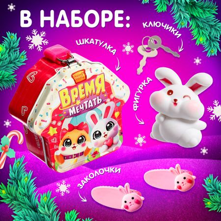 Копилка — сюрприз «Время мечтать», игрушка, заколка, ключики. Игрушка-сюрприз — это приятный презент, который порадует маленькую девочку. Внутри компактной шкатулки-копилки, размером всего 9 × 9 см, вас ждет удивительное открытие. За надежным замочком скрывается набор для маленькой принцессы. <b> Что внутри?</b> <ul> <li> <b> Милый зайчик</b> — нежная пластиковая фигурка зайчика станет верным другом для вашей малышки.</li> <li> <b> Стильные заколки</b> — две яркие заколки помогут создать неповторимый образ. Они легко прикрепляются на волосы и не доставляют дискомфорта.</li> </ul> Шкатулка-сюрприз — это не просто игрушка, станет отличным подарком на любой праздник. Удивите и порадуйте девочку милым и забавным презентом.