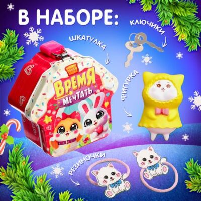Копилка — сюрприз «Время мечтать», игрушка, резинки, ключики. «Время мечтать» — это необычный сюрприз в металлической коробочке, которую можно использовать как шкатулку или копилку. В сюрпризе вам попадется милый котик и две резинки для волос для маленькой принцессы. Набор хорошо подойдет в качестве подарка для девочки. <b> Особенности</b> <ul> <li> Размер шкатулки: 9 × 9 см.</li> <li> В комплекте есть замок и ключи от шкатулки. Поэтому малышка сможет хранить в шкатулке свои маленькие секреты.</li> <li> Вам может попасться 1 из 6 котиков, представленных на картинке. Соберите их всех!</li> </ul>