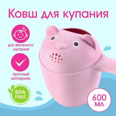 Ковш пластиковый для купания и мытья головы, детский банный ковшик «Мишка», 600 мл., с леечкой, розовый. Ковш используется как продукт для купания, так и просто детская игрушка. У ковшика устойчивое дно, оптимальный объем и в то же время очень легкий вес. Детский ковш сделает процесс купания легким и приятным как для мамы, так и для ребенка.