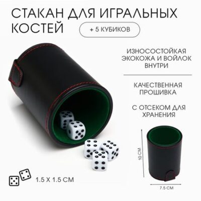 Кожаный стакан для игральных костей, 5 кубиков в комплекте, 7.9×10.2 см. Cтакан для игры в кости — это стильный и функциональный аксессуар для любителей настольных игр. Изготовленный из высококачественной экокожи, он обеспечивает комфорт и надежность во время игры. Внутри стакана находятся пять кубиков, выполненных в цвете слоновой кости. Благодаря удобной форме стакана и тщательно подобранным материалам, игра становится еще более приятной и увлекательной. <b> Особенности:</b> <ul> <li> Внутренняя подкладка из войлока снижает шум в игре при перемешивании кубиков</li> <li> За счет качественного клея войлок прочно держится внутри и не отслаивается</li> <li> Строчка ручной работы заставляет внешнюю кожу плотно прилегать к стакану, что обеспечивает комфортный хват</li> </ul>