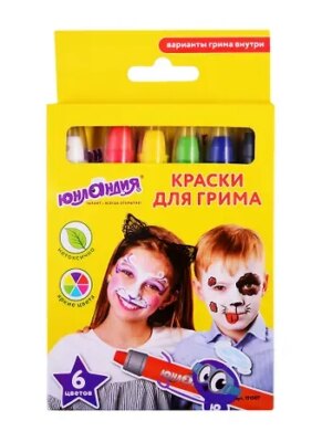 Краски для грима ЮНЛАНДИЯ, Набор 6 цв, яркие цвета, для лица и тела, смываются водой, 191307