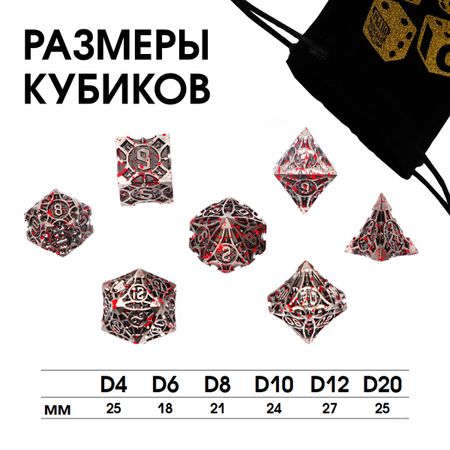 Кубики — дайсы для ДнД, набор 7 шт., кровавые. Dungeons & Dragons (D&D) — это настольная ролевая игра. В D&D игроки создают своих собственных персонажей и отправляются в путешествие по фантастическому миру, сражаясь с монстрами, решая головоломки и выполняя задания. Для определения исхода различных событий в игре используются кубики. Например, если персонаж пытается открыть дверь, кубик может определить, удастся ли ему это сделать и какие препятствия могут возникнуть. Также кубики используются для определения урона в бою, успешности выполнения навыков и других игровых ситуаций. Определения различных характеристик, таких как здоровье, сила, ловкость и интеллект. Определения количества опыта, получаемого персонажем за выполнение заданий или убийство монстров. Определения уровня сложности заданий и монстров, что позволяет игрокам настраивать сложность игры под свои возможности. Определения случайных событий, которые могут произойти во время игры. Набор дайсов D&D нужен игрокам, которые хотят погрузиться в мир приключений, сражений с монстрами и решения головоломок. Кубики помогают создать атмосферу непредсказуемости и делают игру более интересной и захватывающей.