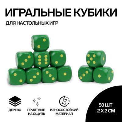 Кубики игральные, 2×2 см, набор 50 шт., зеленые. <b> Кости игральные, 2 × 2 см, набор 50 шт</b> Игральные кубики используются в настольных и азартных играх для определения случайности при принятии решений. Игральная кость представляет собой небольшой предмет, который при падении на ровную поверхность занимает одно из нескольких возможных устойчивых положений. Игроки могут использовать результаты броска кубика для выбора ходов, определения их количества или очков, а также для других игровых действий. Деревянные игральные кости — это идеальный выбор для любителей настольных игр и развлечений. Набор состоит из 50 деревянных костей, каждая из которых имеет размер 2 x 2 см — этого вам точно хватит для множества настолок. Если вы потеряли старые игральные кости или они пришли в негодность — наши станут отличной альтернативой. Кубики изготовлены из высококачественных материалов, что гарантирует их долговечность и безопасность в использовании. Они не деформируются, не выцветают и не теряют своих свойств даже после многократного использования. К тому же безопасны для здоровья и окружающей среды. Кости имеют гладкую поверхность, что обеспечивает комфортное и приятное ощущение при игре. Они не скользят в руке, что делает игровой процесс еще более удобным и приятным. В наборе представлены различные классические комбинации чисел от 1 до 6, что позволяет разнообразить игры и сделать их более интересными. Игра с шестигранными кубиками станет отличным времяпрепровождением как для детей, так и для взрослых. Игровой набор костей придаст вашим вечерам яркость и неповторимость, а также поможет разнообразить свободное время. Он станет отличным подарком для друзей и родственников, которые любят настольные игры и развлечения. Кости подходят для различных возрастных категорий и будут радовать вас и ваших близких на протяжении долгого времени.