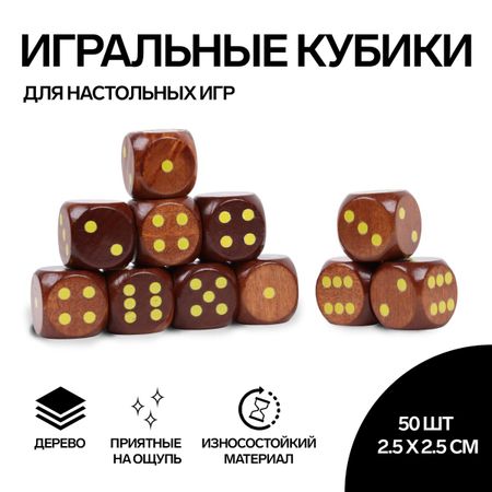Кубики игральные, 2,5×2,5 см, набор 50 шт., коричневые. <b> Кости игральные, 2.5 × 2.5 см, набор 50 шт</b> Игральные кубики используются в настольных и азартных играх для определения случайности при принятии решений. Игральная кость представляет собой небольшой предмет, который при падении на ровную поверхность занимает одно из нескольких возможных устойчивых положений. Игроки могут использовать результаты броска кубика для выбора ходов, определения их количества или очков, а также для других игровых действий. Деревянные игральные кости — это идеальный выбор для любителей настольных игр и развлечений. Набор состоит из 50 деревянных костей, каждая из которых имеет размер 2.5 x 2.5 см — этого вам точно хватит для множества настолок. Если вы потеряли старые игральные кости или они пришли в негодность — наши станут отличной альтернативой. Кубики изготовлены из высококачественных материалов, что гарантирует их долговечность и безопасность в использовании. Они не деформируются, не выцветают и не теряют своих свойств даже после многократного использования. К тому же безопасны для здоровья и окружающей среды. Кости имеют гладкую поверхность, что обеспечивает комфортное и приятное ощущение при игре. Они не скользят в руке, что делает игровой процесс еще более удобным и приятным. В наборе представлены различные классические комбинации чисел от 1 до 6, что позволяет разнообразить игры и сделать их более интересными. Игра с шестигранными кубиками станет отличным времяпрепровождением как для детей, так и для взрослых. Игровой набор костей придаст вашим вечерам яркость и неповторимость, а также поможет разнообразить свободное время. Он станет отличным подарком для друзей и родственников, которые любят настольные игры и развлечения. Кости подходят для различных возрастных категорий и будут радовать вас и ваших близких на протяжении долгого времени.