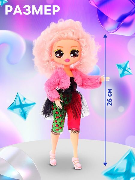Кукла «Кудряшка Рина», шарниры в руках, светло-розовый. Кукла «Кудряшка Рина» с шарнирными руками — стильная модница, с которой легко создать множество сюжетов и образов для увлекательной игры. <b> Особенности</b> <ul> <li> Кукла высотой 26 см с кудрявыми нежно-розовыми локонами, которые можно расчесывать и создавать стильные прически.</li> <li> Рина одета в яркую трендовую одежду, что подчеркивает ее образ современной девчонки.</li> <li> Благодаря шарнирам руки куклы сгибаются и вращаются, делая ее движения естественными и реалистичными.</li> <li> Кукла выполнена из прочного и безопасного пластика. Все материалы гипоаллергенны, без запаха и безопасны для детей от 3 лет.</li> </ul> <b> Играть в куклы — полезно!</b> Игры с куклой помогают девочке развивать чувство стиля, учиться ухаживать за внешностью и придумывать модные образы. Кукла «Кудряшка Рина» станет отличным подарком для девочек старше 3 лет, которые любят модные игры с куклами и мечтают о стильной подружке. Упакована в красивую картонную коробку, идеально подходит для подарка на любой праздник или день рождения. С «Кудряшкой Риной» каждая девочка почувствует себя настоящим стилистом!