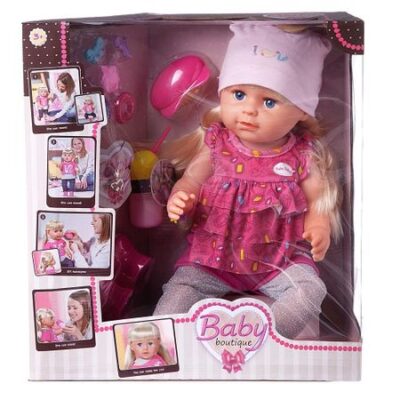 Кукла Baby boutique одета в модную одежду, выглядит современно и стильно. Кукла реалистична и с ней удобно играть в дочки-матери. Одета кукла в серебристые лосины, розовые шортики, а также розовую футболку с тремя воланами и рукавами-крылышками. Ее светлыедлинные волосы скрыты под тоненькой розовой шапочкой, а на ноги нужно обуть кеды из набора. У куклы подвижные конечности, которые позволяют придавать игрушке разнообразные позы. Она умеет пить из бутылочки, а также писать, но только, если нажать на кнопку на ее животе. А если нажать на ее руку, то из глаз куклы потекут слезы.В комплекте с куклой присутствуют бутылочка с трубочкой, расческа, 2 резинки и 3 заколки для создания новых причесок, 2 металлических кулона на веревочках, кеды. Во время игры с куклой ребенок может фантазировать и представить себя заботливой и любящей мамой, при этом развить моторику рук, пространственное мышление и учиться проявлять заботу и ответственность.Батарейки для работы не требуются.
