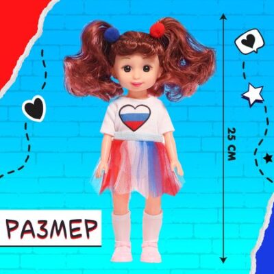 Кукла классическая «Милая: Россия», в боди и юбке. Кукла «Милая: Россия» — это очаровательная игрушка для девочек от 3 лет. Кукла одета в платье с изображением флага России. Наряд придает ей привлекательный патриотичный вид. <b> Особенности куклы</b> <ul> <li> Длинные волосы для творчества. У куклы длинные волосы, с которыми ваш ребенок сможет творить и создавать разнообразные прически и укладки, развивая свою креативность и фантазию.</li> <li> Множество стилей. Ваш ребенок сможет творчески подходить к созданию образов, наряжая куклу в платье, гольфы и обувь. Они с легкостью надеваются и снимаются.</li> <li> Удобный размер. Высота куклы 25 см, поэтому она легко поместится в руке ребенка.</li> <li> Подвижные части тела. Руки и ноги куклы имеют подвижные элементы в плечах и бедрах.</li> </ul> В серии представлены и другие куклы. Соберите их всех! <b> Развитие навыков и веселье</b> Игры с куклой помогают малышам развивать мелкую моторику и воображение. Дети могут придумывать новые образы и истории, что способствует развитию их творческих способностей. Подарите вашему ребенку радость и увлекательные моменты с куклой «Милая: Россия»!
