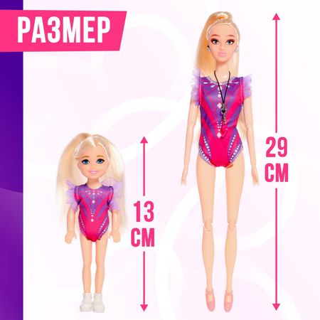 Кукла-модель «Чемпионат по гимнастике», шарнирная. Ваша принцесса любит играть в куклы и увлекается спортом? Тогда кукольная семья гимнасток точно порадует ее. Игрушки упакованы в красочную коробочку, поэтому их можно вручить в подарок даже без дополнительной праздничной упаковки. <b> Подробнее об игрушке</b> <ul> <li> В наборе есть кукла-мама высотой 29,5 см и маленькая кукла-дочка высотой 13,5 см.</li> <li> Обе они шарнирные: шарниры у мамы в плечах, локтях, кистях рук, бедрах, коленях. У дочки — в бедрах и плечах. Это позволяет придавать естественные позы и делает игру более увлекательной.</li> <li> Длинные волосы, прошитые по окружности головы, позволяют делать креативные прически, будь то косы или локоны.</li> <li> Одежда и обувь легко снимаются, поэтому ребенок сможет менять образы и почувствует себя настоящим стилистом! На шее у куклы-мамы висит свисток, который также снимается.</li> <li> В комплект входят атрибуты художественной гимнастики: 2 обруча разных размеров, гимнастическая лента, бутылка воды, кубок.</li> <li> Подходит для детей в возрасте от 3 лет.</li> </ul> <b> Играть в куклы — полезно</b> Взаимодействуя с такими игрушками, девочка осваивает социальные роли, тренирует фантазию и эстетический вкус.