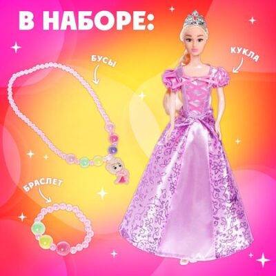 Кукла-модель принцесса «Сказочное королевство» с аксессуарами. Ваша принцесса любит модничать и играть в куклы? Кукла принцесса «Сказочное королевство» с украшениями будет радовать девочку каждый день. <b> Особенности</b> <ul> <li> У куклы красивые волосы. Расчешите их и сделайте модную прическу. Волосы прошиты по всей голове.</li> <li> Праздничное платье дополняет волшебный образ сказочной красавицы. Придумайте для нее свой наряд.</li> <li> Высота куклы — 29 см.</li> <li> В комплект входят украшения для девочки: бусы длиной 40 см, браслет — 13 см, тянется.</li> </ul> <b> Играть в куклы — полезно!</b> Игра с куклой помогает развивать мелкую моторику, творческое мышление и социальные навыки. Девочки учатся заботиться о кукле и придумывать для нее наряды. Это отличный способ провести время с пользой и удовольствием. Кукла «Сказочное королевство» станет желанным подарком для каждой маленькой принцессы.