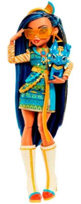 Шарнирная кукла Cleo de Nile это коллекционная игрушка, которая является частью популярной серии Monster High. Эта модница представляет собой монстра — дочь мумии и египетской принцессы. Кукла Клео де Нил имеет очень яркий и запоминающийся образ, основанный на египетской культуре. Ее длинные сине-голубые волосы украшены золотистыми вставками и ободком.Ее глаза коричневого цвета, что подчеркивает ее образ. Тело также имеет некоторые особенности: рука и нога с эффектом мумии.Ее одежда состоит из роскошного платья с золотистыми элементами и длинными рукавами, а также высоких сапог, укороченной курки с лентами, рюкзак в форме пирамиды украшенный скарабеями и гламурные аксессуары.Вдохновитесь на страшно захватывающие приключения в компании Клео и ее забавного питомцаОсобенности:В комплекте милый питомец щенок по имени ТутДлинные волосы, которые можно расчесыватьКуклу можно переодевать. Кисти рук съемныеДополнительные аксессуары: рюкзак, бутылочка в виде сфинкса, снеки, палетка для макияжа, солнечные очки, ожерелье, телефон сережки, ободок и ременьШарнирное тело с точками артикуляции: голова, плечи, локти, кисти, грудь, соединение ног с туловищем, колениОсновные характеристики:Тип: куклаВозраст ребенка: 4Высота куклы: 25 смАксессуары: рюкзак, бутылочка в виде сфинкса, снеки, палетка для макияжа, солнечные очки, ожерелье, телефон сережки, ободок, ременьФункции куклы: можно переодевать, можно причесыватьПитомец: щенок ТутМатериал: ABS пластик, текстильЦвет: разноцветныйКомплектация:Кукла, питомец, аксессуары