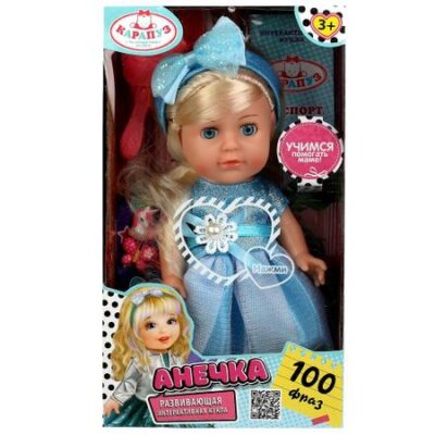 Кукла озвученная АБВГДЕЙКА песня, КАРАПУЗ Y20D-SBB-KARAPUZ-23-RU. Развивающая интерактивная кукла «Анечка» ТМ «Карапуз» станет прекрасным подарком для вашей маленькой принцессы:<br> — поет 2 песни: «АБВГДейка», «Волшебный цветок»<br> — рассказывает 3 стихотворения<br> — знает 2 скороговорки<br> — загадывает 2 загадки<br> — говорит разные фразы<br> — вместе учим вежливые слова<br> — учимся быть аккуратными<br> — учимся помогать маме<br> — закрывает глазки<br> <br> В комплекте:<br> — расческа<br> — 2 заколки<br> <br> Милая кукла с детально проработанным личиком обязательно понравится малышке. Анечка одета в нарядное голубое платье . На голове куколки — красивый ободок. Одежда легко снимается и надевается. У куклы длинные красивые волосы. Хозяйка куколки легко сможет сделать Анечке прическу по своему желанию, для этого в наборе имеется расческа и заколки.<br> <br> Игра с интерактивными куклами ТМ «Карапуз» учит ребенка заботиться об окружающих, быть ответственным и внимательным, а также развивает:<br> — воображение<br> — память<br> — звуковое восприятие и музыкальный слух<br> — социально-коммуникативные навыки<br> <br> Рост куклы: 20 см. Материал: пластмасса + текстиль.<br> Работает от 3-х батареек типа LR44 (в комплекте).<br> Рекомендовано детям от 3-х лет.