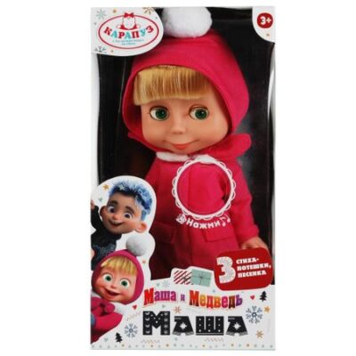 Кукла озвученная Маша и Медведь, КАРАПУЗ 83033-C. Озвученная кукла «Маша» ТМ «Карапуз» станет отличным подарком для поклонниц мультсериала «Маша и Медведь»:<br> — поет песенку <br> — рассказывает 3 стихотворения-потешки<br> — высокое сходство с персонажем<br> <br> Маша одета в розовое пальтишко и теплую косынку с меховой оторочкой. Одежда и аксессуары легко снимаются и надеваются. У куклы детально проработанное лицо и выразительные глаза с длинными ресницами. Милая кукла, выглядящая в точности как героиня популярного мультсериала, непременно вызовет у малышки самые трепетные чувства.<br> <br> Игра с озвученной куклой ТМ «Карапуз» развивает:<br> — социально-коммуникативные навыки<br> — ответственность<br> — музыкальный слух<br> — воображение и фантазию<br> — чувство стиля<br> <br> Рост куклы: 25 см. Материал: пластмасса + текстиль.<br> Работает от 3-х батареек типа LR44 (в комплекте).<br> Рекомендовано детям от 3-х лет.