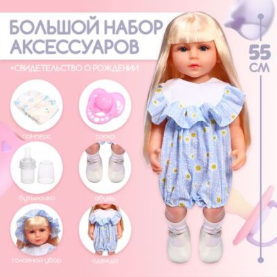Кукла Reborn с аксессуарами, 55 см. Кукла Reborn с набором аксессуаров — это реалистичная игрушка, которая подарит ребенку радость и возможность проявить заботу. С куклой можно купаться, ее высота — 55 см. Ее тело выполнено из мягкого винила, который придает кукле подвижность и натуральный вид. <b> Особенности куклы</b> <ul> <li> Длинные светлые волосы из качественного канекалона можно расчесывать, заплетать и мыть, что позволит ребенку проявить фантазию в создании причесок.</li> <li> Пушистые реснички и нежный румянец на щечках придают кукле выразительный и реалистичный вид.</li> <li> В комплекте множество аксессуаров: памперс, соска, бутылочка, головной убор, одежда, обувь, а также свидетельство о рождении.</li> </ul> <b> Развивающий эффект</b> Игра с куклой способствует развитию моторики, формирует навыки ухода и заботы, учит ребенка быть внимательным к деталям. Ребенок может купать куклу и заботиться о ней, что помогает развить воображение и социальные навыки. Эта кукла станет отличным подарком на день рождения или другой значимый праздник. Благодаря большому количеству аксессуаров, с ней можно устроить множество разных игровых сценариев, что сделает процесс игры увлекательным и познавательным.