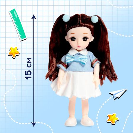 Кукла шарнирная «Школьные секреты». Ваша принцесса любит играть в куклы и модничать? Значит, тематическая куколка станет эффектным подарком для нее или хорошим поощрением за успехи. <b> Особенности куклы</b> <ul> <li> Высота — 15 см.</li> <li> Шарнирная кукла обладает высокой подвижностью тела. У нее есть несколько точек артикуляции, которые позволяют ей принимать естественные позы.</li> <li> Одежду легко снять и подобрать другой наряд — так ваша малышка сможет проводить эксперименты с образами.</li> <li> Волосы густые и длинные, что позволит попрактиковаться и научиться делать разные прически.</li> </ul> <b> Играть в куклы — полезно</b> Такие занятия способствуют развитию воображения, эмоционального восприятия и тактильных ощущений. В процессе игры девочка осваивает социальные роли, совершенствует эстетический вкус и проецирует в игру модели поведения взрослых.