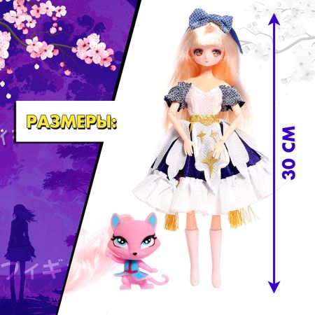 Кукла шарнирная «Пушистая мода», с питомцем. Шарнирная кукла «Пушистая магия» — настоящая мечта для каждой девочки, которая любит аниме и моду. В комплекте с куклой идет милый питомец, который станет ей верным другом. Куколка упакована в красочную коробку, поэтому ее можно вручить в качестве подарка без дополнительной праздничной упаковки. <b> Подробнее об игрушке</b> <ul> <li> Кукла высотой 30 см, с большими выразительными глазами и милой улыбкой, выполнена в стиле аниме.</li> <li> Шарниры в плечах, локтях, кистях рук, бедрах и коленях. Поэтому кукла может принимать различные позы.</li> <li> Куколка одета в красочное сине-белое платье. Образ дополняет повязка с бантом на голове. Поэтому она составит компанию вашему ребенку на любом мероприятии.</li> <li> Одежда и обувь легко снимаются, поэтому ребенок сможет менять образы и почувствует себя стилистом!</li> <li> Головной убор не снимается.</li> <li> Длинные волосы куклы и питомца позволяют делать креативные прически — косы или локоны. У куклы волосы прошиты по окружности головы.</li> <li> Головной убор не снимается.</li> <li> Высота питомца — 4,5 см.</li> <li> Подходит для детей в возрасте от 3 лет.</li> </ul> В серии кукол представлены и другие персонажи. Соберите их все! <b> Играть в куклы — полезно</b> Взаимодействуя с такими игрушками, девочка улучшает сообразительность, тренирует фантазию и эстетический вкус.