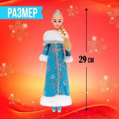 Кукла-снегурочка шарнирная «Зимняя царевна». Ваша малышка не знает, как передать пожелания Деду Морозу? Тогда «Зимняя царевна» в костюме Снегурочки поможет ей в этом и станет эффектным подарком на Новый Год! Вместе с «Зимней царевной» ребенок загадает желание Деду Морозу, отметит новогодние праздники или проведет сказочный утренник для родителей. Игрушка упакована в красочную коробочку, поэтому ее можно вручить в подарок даже без дополнительного праздничного оформления. <b> Подробнее об игрушке</b> <ul> <li> Высота куклы — 28 см.</li> <li> Кукла шарнирная в локтях, кистях рук и коленях, также имеются подвижные элементы в плечах и бедрах, что позволяет придавать ей естественные позы и делает игру более увлекательной.</li> <li> Одежда, корона и обувь куклы легко снимаются, поэтому ребенок сможет менять образы и почувствует себя настоящим стилистом!</li> <li> Одежда фиксируется липучками, поэтому выглядит аккуратно и хорошо сидит на кукле. А еще с такими застежками малышка сможет без труда переодеть ее. У воротника нет застежки, снимается через голову.</li> <li> Длинные волосы позволяют делать креативные прически, будь то косы или локоны. Прошиты по окружности головы.</li> </ul> <b> Играть в куклы — полезно</b> Взаимодействуя с такими игрушками, девочка осваивает социальные роли, тренирует фантазию и эстетический вкус.