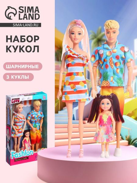 Куклы шарнирные «Семейная прогулка», набор 3 шт.. Набор «Семейная прогулка» — это увлекательная игрушка, которая поможет ребенку погрузиться в мир семейных ценностей и ролевых игр. В комплекте три куклы: мама, папа и их маленькая дочка. <b> Особенности</b> <ul> <li> В набор входят три куклы: мама — 30 см, папа — 29 см, дочка — 13,5 см.</li> <li> У кукол папы и мамы шарнирное тело, что позволяет менять позы и создавать динамичные сцены.</li> <li> Мама и дочка имеют длинные волосы, которые можно расчесывать и укладывать.</li> <li> Каждая кукла одета в стильную летнюю одежду.</li> </ul> <b> Играть в куклы — полезно</b> Игра с набором помогает ребенку лучше понимать взаимоотношения в семье, учит заботе и ответственности. Меняя позы кукол и придумывая сюжеты, дети развивают мелкую моторику, творческое мышление и коммуникативные навыки.