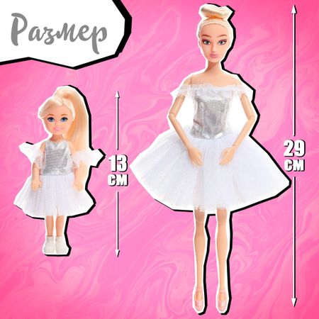 Куклы шарнирные «Школа балета», набор 2 шт.. Представляем вашему вниманию набор из двух кукол, идеально подходящий для юных балерин и всех, кто увлекается миром танца. Этот набор позволит воссоздать атмосферу балетной школы и разыграть множество увлекательных историй. <b> Особенности</b> <ul> <li> Кукла высотой 29 см обладает высокой подвижностью благодаря шарнирам в плечах, локтях, кистях, бедрах, коленях. Это позволяет ей принимать самые разнообразные позы, характерные для балетных движений.</li> <li> Кукла-малышка высотой 13 см — ручки и ножки малышки подвижны, это позволяет ей выполнять простые танцевальные элементы. Длинные волосы куклы можно расчесывать и создавать различные прически.</li> <li> Обе куклы одеты в изящные белые балетные пачки, подчеркивающие их грациозность и хрупкость.</li> </ul> Набор шарнирных кукол «Школа балета» подойдет в качестве подарка для девочек, увлекающихся танцами, куклами или просто творческими играми. Куклы станут отличным дополнением к детской игровой комнате и позволит ребенку развивать свои творческие способности и воображение.