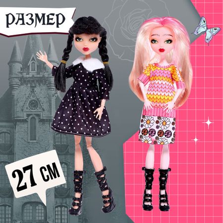 Куклы шарнирные «Милые злодейки», набор 2 шт.. Набор шарнирных кукол «Милые злодейки» включает в себя двух персонажей — Уэнздей и Энид, каждая из которых обладает ярким индивидуальным стилем и особенностями. Благодаря съемной одежде и стильным прическам, дети могут создавать различные образы для своих любимых персонажей и развивать фантазию. <b> Особенности набора</b> <ul> <li> Куклы высотой 27 см — идеальный размер для удобной игры и хранения</li> <li> Съемная одежда — позволяет менять наряды и создавать новые модные образы</li> <li> Подвижные части тела — делают игру динамичной и помогают разыгрывать различные сцены и истории</li> <li> Стильные прически — каждая кукла обладает уникальной укладкой, подчеркивающей их характер</li> <li> Персонажи Уэнздей и Энид — воплощают разные стили и характеры, что делает игру интересной и разнообразной</li> </ul> <b> Преимущества игры с куклами</b> Игра с набором кукол способствует развитию творческих навыков и воображения, помогает детям в развитии мелкой моторики и координации движений. Дети могут экспериментировать с модой, комбинируя наряды и создавая уникальные образы, что развивает их чувство стиля и эстетическое восприятие. Этот набор станет прекрасным подарком для детей, которые увлекаются играми с куклами и любят создавать свои собственные истории и образы. Куклы с уникальными стилями и подвижными частями тела подарят много радости и позволят маленьким творцам развивать свою фантазию и креативность.