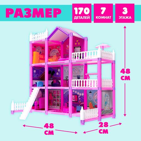 Кукольный домик «Яркая мечта», с аксессуарами. Что может быть лучше кукольного домика для маленькой принцессы? Только набор с 3-этажным коттеджем, мебелью и гирляндой! С таким набором малышка обустроит уютный уголок и придумает множество увлекательных сюжетно-ролевых игр. Он станет отличным подарком на любой праздник! <b> Подробнее о наборе</b> <ul> <li> Высота домика — 48 см. Высота этажа — 12 см.</li> <li> Подходит для кукол высотой до 12 см.</li> <li> В комплекте мебель и другие предметы: музыкальная станция, комод, пианино, качели розовые (качаются), качели голубые (не качаются), лежаки, стол с зонтом, кухонный гарнитур, холодильник, обеденный стол, стулья, шкаф, кровать, раковина, кресла, диван, журнальный столик, часы.</li> <li> Также в наборе гирлянда длиной 2 метра. Малышка украсит домик и создаст уютную обстановку в нем.</li> <li> Для работы гирлянды необходимо 3 батарейки типоразмера LR44. В набор входят.</li> <li> Набор подходит для детей в возрасте от 3 лет.</li> </ul> <b> Польза игр с домом для кукол</b> Игры с набором способствуют развитию воображения, мышления, цветового и эмоционального восприятия ребенка. Девочка осваивает социальные роли, проецирует модели поведения взрослых на игровые сюжеты, учится заботе и ответственности.