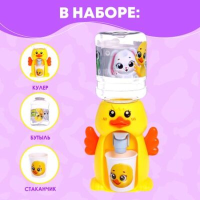 Кулер Baby zoo «Утенок», 185мл. Компактный кулер для воды с небольшим резервуаром дополнит интерьер кухни маленькой хозяюшки и сделает игровые сюжеты более реалистичными. <b> Особенности</b> <ul> <li> Объем бутылочки — 185 мл.</li> <li> В комплект входит пластиковый стаканчик высотой 4 см.</li> <li> Чтобы налить воду, нужно нажать на краник.</li> </ul> <b> Подготовка к использованию</b> <ol> <li> Снимите бутылку с кулера.</li> <li> Вымойте емкость, а затем наберите в нее воду.</li> <li> Закрутите кулер на бутылочке.</li> <li> Аккуратно переверните кулер вместе с емкостью.</li> </ol>