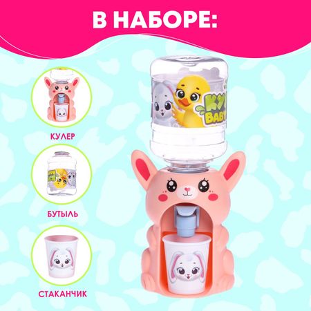 Кулер детский для воды Baby zoo «Зайчик», 185 мл. Компактный кулер для воды с небольшим резервуаром дополнит интерьер кухни маленькой хозяюшки и сделает игровые сюжеты более реалистичными. <b> Особенности</b> <ul> <li> Объем бутылочки — 185 мл.</li> <li> В комплект входит пластиковый стаканчик высотой 4 см.</li> <li> Чтобы налить воду, нужно нажать на краник.</li> </ul> <b> Подготовка к использованию</b> <ol> <li> Снимите бутылку с кулера.</li> <li> Вымойте емкость, а затем наберите в нее воду.</li> <li> Закрутите кулер на бутылочке.</li> <li> Аккуратно переверните кулер вместе с емкостью.</li> </ol>