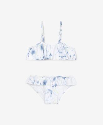Пляжный сезон не за горами, а значит, самое время присмотреться к белому раздельному купальнику с цветочным принтом! Изделие выполнено эластичного материала, который не сковывает движений, прекрасно держит форму и быстро сохнет. Купальник имеет регулируемые бретели. Рюши на лифе и трусиках делают купальник очень нежным, воздушным, девичьим.