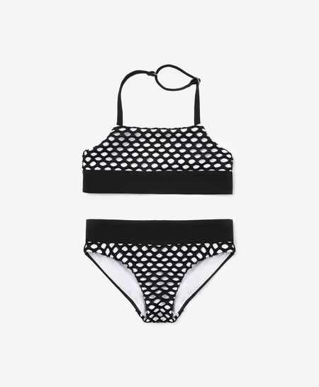 Раздельный купальник, состоящий из трусиков и лифа — прекрасное решение для пляжного отдыха! Сочетание однотонного эластичного материала и чёрной сетки делает купальник оригинальным и интересным. Лиф с широкой эластичной тесьмой по низу фиксируется на теле с помощью завязок. Трусики с аналогичной тесьмой оформлены шрифтовыми элементами.