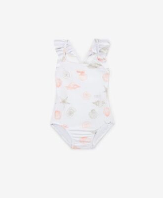 Очаровательный купальник создан для морских приключений! Слитный белый купальник с изображениями ракушек и морских звёзд — прекрасное решение для пляжного отдыха. Эластичный материал не сковывает движений, прекрасно держит форму и быстро сохнет. Бретели с оборками перекрещиваются на спинке, что очень комфортно для маленького ребенка. В оформлении модели использована жаккардовая нашивка.