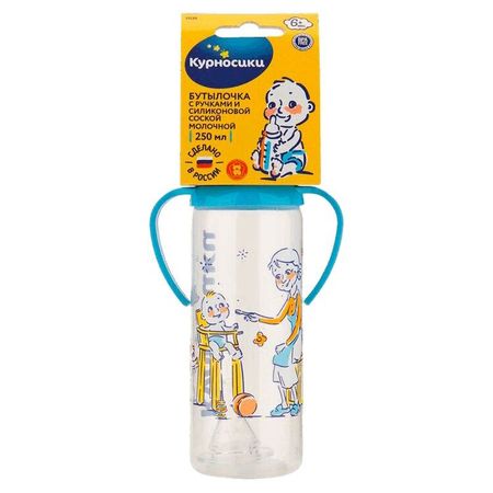 Бутылочка полипропиленовая с ручками, с силиконовой соской молочной, 250 мл. Бутылочка произведена из полипропилена — термостойкого небьющегося пластика, не вступающего в химическую реакцию с молоком и не выделяющего вредных веществ при стерилизации. Возраст применения — с 6 месяцев. Цвета: желтый, оранжевый, голубой.