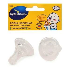 Силиконовая соска большого размера «Курносики» разработана с учетом возраста и физиологических особенностей младенцев от 6 месяцев.Преимущества Соска изготовлена из силикона — синтетического эластичного материала, который не имеет вкуса и запаха, не мутнеет при стерилизации. Соска классической формы всегда занимает правильное положение во рту ребенка. Величина отверстия соски обеспечивает средний поток, оптимальный для густого питания: каш, соков, кисломолочных продуктов. Соску разрешено стерилизовать различными способами. Соска имеет антиколиковый клапан, который снижает вероятность заглатывания малышом воздуха при кормлении. Соска подходит ко всем бутылочкам со стандартным горлом.ХарактеристикиВ комплекте – 2 шт.Срок службы: 1 месяц.