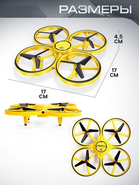 Квадрокоптер DRON, с управлением жестами. Радиоуправляемый квадрокоптер DRONE приведет в восторг любого малыша! Ребенок сможет одним взмахом руки задавать устройству направление благодаря функции управления жестами. У DRONE компактные размеры, он прост в использовании, поэтому маленький герой легко разберется в управлении игрушкой без помощи взрослых. Также квадрокоптер оснащен защитой несущих винтов от ударов об препятствия, что позволяет играть с ним без лишних опасений. <b> Особенности</b> <ul> <li> Размер: 17 × 17 × 4,5 см.</li> <li> Сделан из качественного нетоксичного пластика.</li> <li> Предназначен для детей от 6 лет.</li> <li> Имеет простую и удобную зарядку — USB-кабель.</li> <li> Дрон и пульт управления работают от аккумулятора.</li> </ul> <b> Игра с дроном развивает</b> <ul> <li> Координацию движений. Ребенок развивает ловкость, маневрируя перед препятствиями.</li> <li> Внимание и концентрацию. Нужно хорошо сосредоточиться, чтобы управлять дроном и удерживать его в воздухе.</li> <li> Способность принимать решения. Чтобы успешно поднять и приземлить дрон, ребенку нужно будет быстро сориентироваться.</li> </ul>