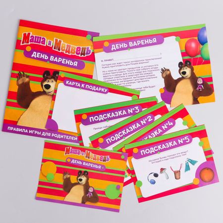 Квест по поиску подарка, игра «День варенья», Маша и Медведь. <b> Для самых креативных родителей!</b> Игра-квест по поиску подарка поможет вам организовать необычное вручение презента. Она включает в себя несколько этапов, которые представляют собой поиск подсказок. Каждая подсказка — ребус, загадка или головоломка. Малыш почувствует себя настоящим детективом, решая задачки, которые придумала для него Маша! Приготовьте подарок и спрячьте подсказки в указанных местах в квартире, а юный сыщик будет их искать. <b> В наборе:</b> <ul> <li> правила для родителей;</li> <li> карточки с подсказками; </li> <li> письмо. </li> </ul> <b> Играйте и развивайтесь вместе с Машей!</b>