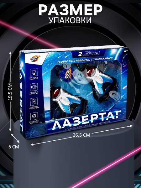Лазертаг с безопасными инфракрасными лучами, для двух игроков. С лазертагом малыш станет победителем захватывающих сражений! Игра предназначена для двух игроков. Устройте интересные бои дома и на улице: инфракрасные лучи не нанесут вреда здоровью ребенка, а звуковые эффекты добавят реалистичности и азарта. <b> Как играть</b> <ul> <li> Закрепите на руках браслеты, прицельтесь в соперника и сожмите кулак для выстрела.</li> <li> При попадании в соперника, перчатка издает звуковой сигнал. После 5 попаданий будут воспроизведены 4 звуковых сигнала. Это значит, что соперник почти побежден.</li> <li> После 6 попаданий вы услышите особый звук.</li> <li> Поздравляем, вы выиграли! Чтобы начать игру сначала, соперник должен нажать кнопку «Перезарядка».</li> </ul> <b> Особенности</b> <ul> <li> В комплекте есть 2 браслета, которые предназначены для двух участников.</li> <li> Браслеты работают от 6 батареек типоразмера LR44.</li> <li> Звуковые эффекты: игрушки воспроизводят звук выстрела.</li> <li> Световые эффекты: в браслетах горят инфракрасные лучи красным светом.</li> <li> Игрушки сделаны из высококачественного пластика без применения токсичных веществ.</li> </ul> <b> Играем с пользой</b> C лазертагом малыш не только весело проведет время, но и сможет развить важные навыки. Игрушка поспособствует развитию координации движений и скорости реакции, улучшит стратегическое мышление.