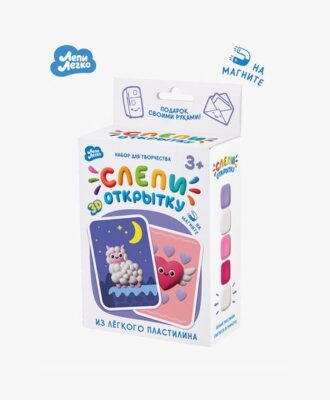 Набор для создания 3D открытки из легкого пластилина, с магнитом в комплекте. Легкий пластилин ТМ Лепи легко невероятно воздушный на ощупь! Так легко лепить еще никогда не было: создай и подари самую милую открытку! Внимание — белый легкий пластилин светится в темноте! В набора входят: 2 цветные открытки с милыми персонажами, 2 магнита, 5 пакетиков легкого пластилина, в том числе 1 пакетик со светящимся в темноте, глазки, стек. Сделай подарок своими руками для самых любимых.