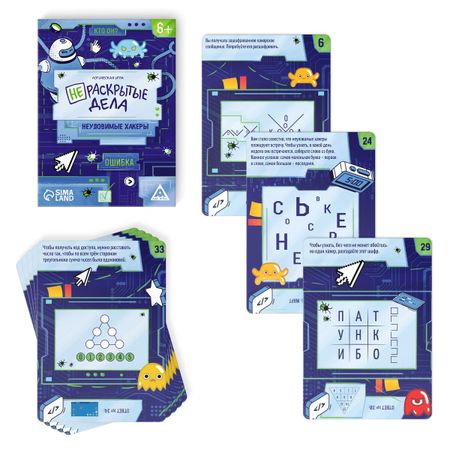 Логическая игра «Нераскрытые дела. Неуловимые хакеры», 20 карточек, 6+. <b> Почувствуйте себя настоящим хакером</b> В этой игре вам предстоит собирать микросхемы, подбирать пароль от компьютера и даже бороться с вирусами. Внутри вас ждет почти 40 логических задачек, головоломок и ребусов. С их помощью можно натренировать внимание, логику и мышление. <b> Что нужно делать?</b> Задания в карточках не связаны друг с другом, поэтому вы можете решать их в любом порядке. Главное — подготовить ручку или карандаш. Какие задания ждут в игре? Шифры и головоломки, чтение задом-наперед и вверх ногами, ребусы, задания на счет, лабиринты, задачки на пространственное мышление и многое другое. <b> Состав</b> : 20 двухсторонних карт.