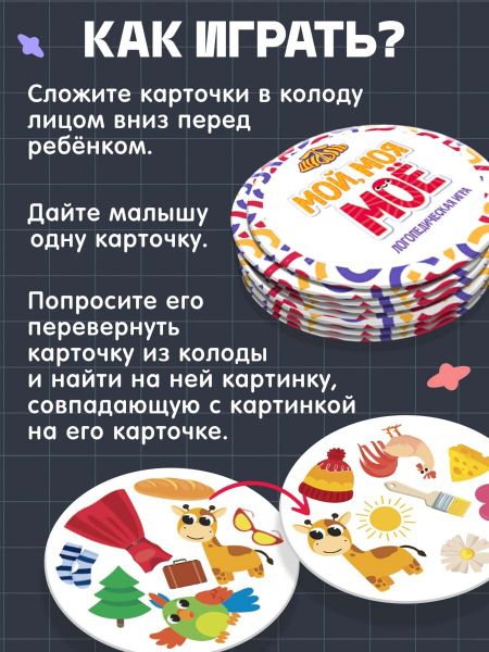 Логопедическая игра «Мой, моя, мое». Ищите совпадения на карточках и развивайте речь в легкой игровой форме с логопедической игрой «Мой, моя, мое»! Ребенку предстоит находить одинаковые предметы и использовать правильные местоимения, чтобы заявить, что он справился. А в игре с несколькими игроками это нужно делать на скорость, благодаря чему процесс становится еще интереснее! <b> Как играть</b> Предусмотрено несколько вариантов игры. Вот один из них: <ol> <li> Сложите карточки в колоду лицом вниз перед ребенком.</li> <li> Дайте малышу одну карточку.</li> <li> Попросите его перевернуть карточку из колоды и найти на ней картинку, совпадающую с картинкой на его карточке.</li> </ol> Другие варианты игры вы найдете в инструкции внутри коробки. <b> Чем полезна игра</b> С логопедической игрой «Мой, моя, мое» ребенок научится правильно согласовывать местоимения с существительными, пополнит словарный запас и потренирует внимательность и словесно-логическое мышление. Логопедическая игра «Мой, моя, мое» рекомендована для детей от 3 лет.
