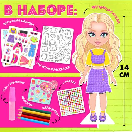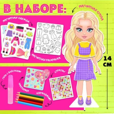 Магнитная игра «Модный домик:Лили». Магнитная игра «Модный домик: Лили» станет увлекательным занятием для детей, любящих создавать свои модные образы и придумывать истории. В комплект входит кукла, восемь стильных нарядов, а также аксессуары и украшения для дополнительного декора. Все элементы выполнены на магнитах, что позволяет легко менять одежду и аксессуары, создавая новые образы для куклы. <b> Особенности</b> <ul> <li> Магнитная кукла 14 см с одеждой на магнитах — дети смогут экспериментировать с различными стилями, создавая яркие образы</li> <li> Магнитная раскраска и карандаши — помогут раскрыть творческие способности и развить художественные навыки</li> <li> Гель с блестками и стразы — для дополнительного декорирования одежды и аксессуаров</li> <li> Наклейки для украшения домика и создания индивидуального интерьера</li> <li> Кукольный домик высотой 18 см — компактное пространство для игр, которое можно украсить по своему вкусу</li> </ul> <b> Польза и развивающие элементы</b> Игра с магнитной куклой развивает у ребенка мелкую моторику и координацию движений, а также творческое мышление и воображение. Возможность декорировать наряды стразами и блестками делает процесс игры более интересным и увлекательным, что способствует развитию внимательности и усидчивости. Магнитная игра «Модный домик: Лили» отлично подойдет в качестве подарка на день рождения или любой другой праздник. Она принесет много радости и станет источником вдохновения для маленьких модниц и дизайнеров.