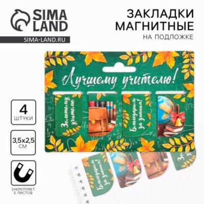 Магнитные закладки для книг, 4 шт. «Лучшему учителю». Закладки магнитные на подложке для книг, обладают эксклюзивным дизайном, который делает их отличным подарком к празднику! Магнитные закладки — уникальные современные приспособления для тех, кто любит читать и хранить важную информацию в бумажном виде. Их удобство неоценимо: благодаря магнитам они не потеряются и не выпадут из книги или записной книжки. <ul> <li> Вид упаковки: подложка, пакет;</li> <li> В упаковке, шт.: 4;</li> <li> Материал: магнит, картон;</li> <li> Размер закладки : 2,5см х 4см.</li> </ul>