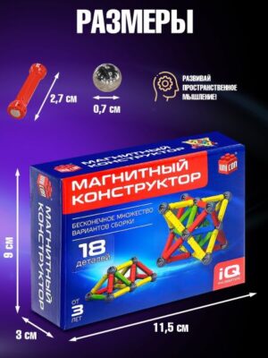 Магнитный конструктор, 18 деталей. <b> Почувствуйте силу притяжения! </b> Представляем вашему вниманию конструктор нового поколения, который будет интересен не только детям, но и их родителям. Магнитный конструктор — это не только увлекательная игра, но и эффективный инструмент развития ребенка. Фантазию малыша ни что не будет ограничивать, ведь здесь нет никаких креплений: придумайте форму, а под действием магнитного поля детали сами соединятся друг с другом. <b> Приступим к экспериментам</b> В наборе вы найдете магнитные палочки, металлические шарики и дополнительные элементы для конструирования. Соберите простые 3D-фигуры или сложные модели, сочетая магнитные палочки и стальные шарики. У вас все получится! <b> Неоспоримая польза! </b> Играя с магнитным конструктором, малыш знакомится с основами физики и геометрии, формирует пространственное и логическое мышление. У ребенка развивается мелкая моторика, проявляются творческие способности. В наборе 18 деталей: 8 шариков, 10 палочек. Размеры элементов: Длина палочки: 2,7 см. Диаметр шара: 0,7 см. Товар предназначен для детей старше 3 лет.