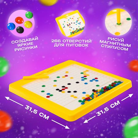 Магнитный планшет для рисования «Пуговки», большой, 10 трафаретов, 266 ячеек, 126 пуговок. Игра «Магнитное рисование» поможет обучить ребенка письму в дошкольном возрасте. В комплект входит планшет с разноцветными пуговками и ручка-магнит. Перемещать элементы легко – они сами слушаются палочку с намагниченным наконечником и перелетают в круглые прозрачные ячейки. Малышу не нужно прикасаться к ним руками – чтобы пуговка следовала за стилусом проведите им по панели перемещая в одно из отверстий. Пока ребенок совсем маленький, можно использовать обучающие карточки (входят в комплект) и повторять рисунки на них. Когда он подрастет, — придумывать сюжеты самому. Большое поле позволяет рисовать все, что придет в голову.