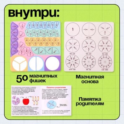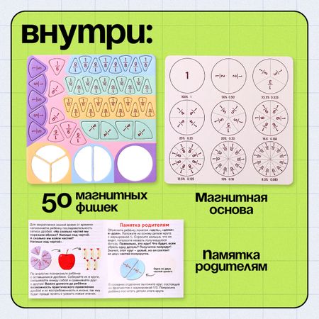 Магнитный развивающий набор «Части и целое», 50 фишек, 7+. Магнитный набор «Части и целое» поможет ребенку освоить азы математики и познакомиться с дробями в увлекательной форме. Он подходит для детей от 7 лет и делает обучение легким и наглядным. Благодаря магнитной основе элементы удобно крепятся на поверхность, а 50 красочных фишек помогут визуализировать дроби и их соотношение с целым. <b> Что внутри?</b> <ul> <li> 50 магнитных фишек.</li> <li> Магнитная основа для удобного размещения элементов.</li> <li> Памятка для родителей с рекомендациями по обучению.</li> </ul> <b> Особенности набора</b> <ul> <li> Визуальное представление дробей упрощает понимание.</li> <li> Магнитные элементы легко крепятся.</li> <li> Развитие ключевых навыков: логика, память, математическое мышление.</li> <li> Игровой формат — учеба превращается в увлекательное занятие.</li> </ul> <b> Набор поможет:</b> <ul> <li> Изучить понятия «целое», «часть» и «доля».</li> <li> Понять принцип построения простых дробей.</li> <li> Понять основы деления.</li> <li> Понять как составляются проценты.</li> <li> Развить математическое мышление.</li> </ul> Этот набор станет отличным помощником для детей, осваивающих дроби, и позволит родителям проводить занятия в игровой форме.